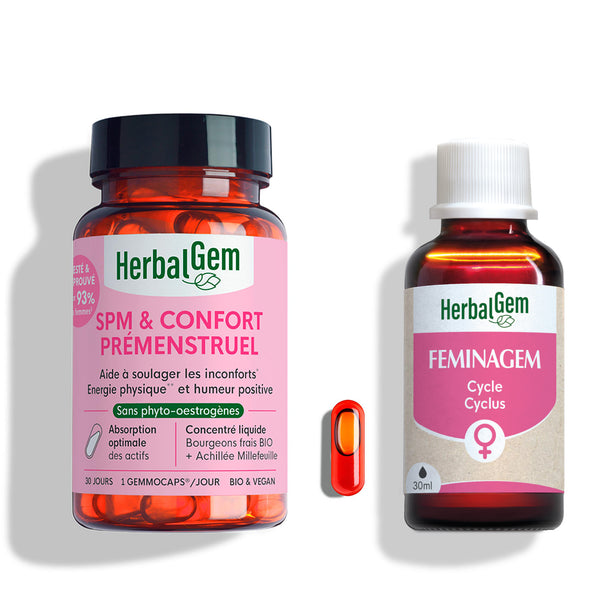 Découvrez notre cure bien-être dédiée au confort féminin avec Gemmocaps SPM, Confort Menstruel et le complexe Feminagem. Une synergie naturelle de bourgeons et d’extraits de plantes pour apaiser les désagréments du cycle menstruel et favoriser l'énergie au quotidien. 🌿✨