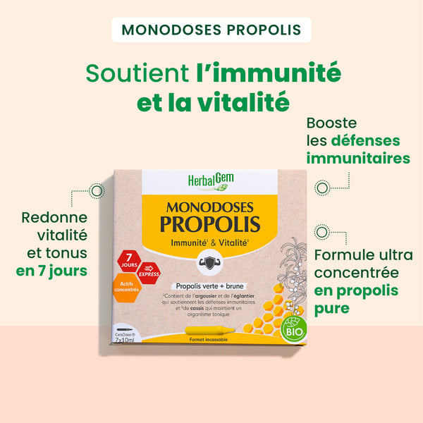 Une cure express de 7 jours pour soutenir l’immunité et retrouver de la vitalité grâce aux Monodoses Propolis BIO. Une formule concentrée en propolis verte & brune, enrichie de Bourgeons de Cassis & d’Eglantier et de jus d’Argousier, dans un format pratique, nomade et 100 % recyclable.