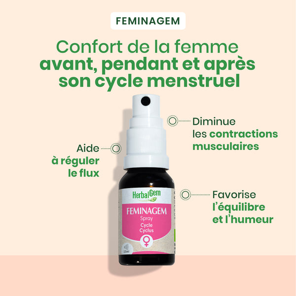 During periods of painful menstruation, FEMINAGEM helps soothe discomfort associated with the menstrual cycle and promotes greater overall comfort. Used during menstruation, it supports every woman in her quest for harmony and serenity.